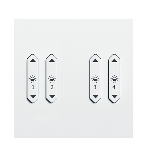 Wipptaster 4fach Licht, zum individuellen verändern von Aktoren in einer Lichtstimmung eines Raumes. Das Gehäuse und die 4 Stück Tasterwippen bestehen aus Kunststoff, Oberfläche seidenmatt, weiß. Alle Tasten sind mit intuitiven Piktogrammen bedruckt. Die Montage erfolgt in einer einfachen Standard-Eurodose bzw. einer UK-Metall-Backbox, Schrauben sind nach der Montage nicht sichtbar. Das Bediengerät wird mit Hilfe einer Schraubsteckklemme an den Bus und optional an die Versorgung (beide verpolbar) angeschlossen. Die Versorgung erfolgt über ein externes Netzteil 24VDC, AC oder direkt über den Bus. Abmessungen: 87 x 87 x 13 mm, Gewicht: 0,1 kg.