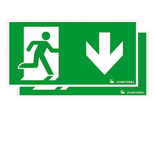 Sicherheitszeichen für CROSSIGN 160 MSC/TEC-GP Abdeckung mit Sicherheitszeichen , PC, mit Digitaldruck, Sicherheitszeichen gemäß ISO 7010: 2seitig, Symbol: Rettungsweg/Notausgang. Richtungspfeil nach unten, Abmessung: 322 x 5 x 160 mm, Gewicht: 0,39 kg.