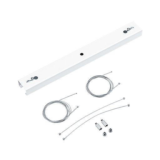 Montagezubehör für die 1-Punkt-Seilaufhängung des CRAFT II performance in der Größe M. Die Lieferung besteht aus einer Schiene, einer Seil und Schrauben zur Befestigung. Die Schiene wird mit einer Schraube an der Decke befestigt und bietet zwei Befestigungspunkte für die Seilabhängung. Mit diesem Zubehör kann die Leuchte bis zu max. 2,17 m. von der Decke abgehängt werden. Der Mindestabstand zur Decke beträgt 0,26 m.