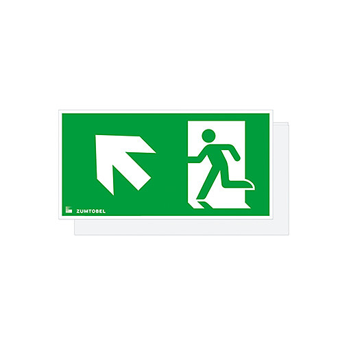 Sicherheitszeichen für CROSSIGN 110 MSC/TEC-GP, Abdeckung mit Sicherheitszeichen aus PC mit Digitaldruck, Sicherheitszeichen gemäß ISO 7010: 1seitig, Symbol: Rettungsweg/Notausgang. Richtungspfeil zur Seite nach oben, Erkennungsweite gemäß EN 1838: 22 m, Abmessung: 222 x 5 x 110 mm, Gewicht: 0,19 kg.
