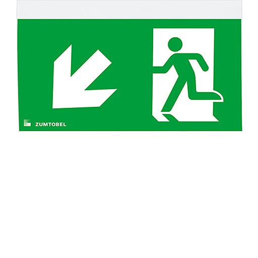 Sicherheitszeichen für COMSIGN 150 P MSC-WF/MRC-WF/MRCR-WF mit Aluminium Druckgussabdeckcover silber, pulverbeschichtet, zur einfachen Montage auf die PURESIGN/COMSIGN 150 P Gehäuse für Seilabhängung, max. Seilabhängung: 1,5 m, gleichmäßige Hinterleuchtung des Piktogramms, Leuchtdichte > 500 cd/m² im weißen Bereich, Piktogramm per Digitaldruck auf die Acrylglasplatte aufgebracht, Sicherheitszeichen gemäß ISO 7010: 1seitig, Symbol: Rettungsweg/Notausgang. Richtungspfeil zur Seite nach unten, Erkennungsweite gemäß EN 1838: 30 m, Abmessung: 300 x 16 x 188 mm, Gewicht: 0,83 kg.