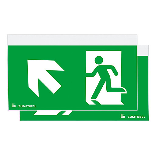 Sicherheitszeichen für COMSIGN 150 P MSC-WF/MRC-WF/MRCR-WF mit Aluminium Druckgussabdeckcover silber, pulverbeschichtet, zur einfachen Montage auf die PURESIGN/COMSIGN 150 P Gehäuse für Seilabhängung, max. Seilabhängung: 1,5 m, gleichmäßige Hinterleuchtung des Piktogramms, Leuchtdichte > 500 cd/m² im weißen Bereich, Piktogramm per Digitaldruck auf die Acrylglasplatte aufgebracht, Sicherheitszeichen gemäß ISO 7010: 2seitig, Symbol: Rettungsweg/Notausgang. Richtungspfeil zur Seite nach oben, Erkennungsweite gemäß EN 1838: 30 m, Abmessung: 300 x 16 x 188 mm, Gewicht: 0,83 kg.