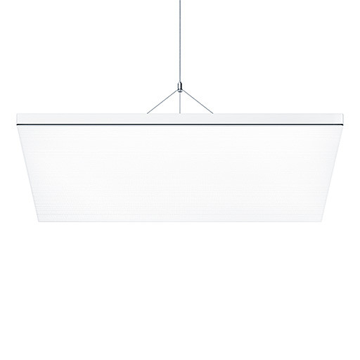 Rahmenlose Direkt/Indirekt LED Pendelleuchte mit MPO+ Micropyramiden-Optik und separat steuerbarem Indirektlicht zur Deckenaufhellung mit Batwinglichtverteilung. Leuchten Leistung: 52 W, DALI steuerbare Leuchte mit LED-Konverter, LED-Lebensdauer 100000 h bis zu einem Lichtstromrückgang auf 85 % des Anfangswertes. Farborttoleranz (initial MacAdam): 3. Leuchten Lichtstrom: 5866 lm, Leuchten Lichtausbeute: 113 lm/W. Farbwiedergabe Ra > 90, Farbtemperatur 4000 K. Abstrahlcharakteristik direkt/indirekt im Verhältnis 70:30, LEDs beidseitig eingekoppelt, Lichtlenkung basierend auf hocheffizienter LitePrint(R)-Lichtleiter-Technik in Kombination mit mehrschichtiger MPO+ Micropyramiden-Optik mit fugenlosem Erscheinungsbild und definierter Lichtauskopplung für entblendete Lichtverteilung mit UGR < 19 und L65 < 3000 cd/m² gemäß EN 12464, reduzierte Leuchtdichte unter steilen Winkeln zur Entblendung von stark geneigten Displays und für max. Flexibilität, homogene Auflösung der LED-Lichtpunkte, gleichmäßige indirekte Lichtverteilung optimiert für geringe Abhängehöhe von min. 50 cm. Glatte äußere Abdeckung aus hochreinem Polymethylmethacrylate, geringe Schmutzempfindlichkeit und einfache Reinigung durch glatte äußere Abdeckung. Hochwertiges Leuchtengehäuse aus Stahlblech, pulverbeschichtet mit umlaufendem Optikrahmen ohne Naht oder Fuge in weiß. Seil-Abhängeset mit transparenter Anschlussleitung sind separat zu bestellen. Abhängehöhe stufenlos einstellbar. Leuchte halogenfrei verdrahtet, Abmessungen: 603 x 603 x 50 mm, Gewicht: 9 kg.