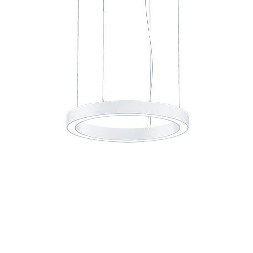 Ringförmige, direkt/indirekt strahlende LED Pendelleuchte, mit schlankem Aluminium Profilgehäuse in Farbe weiß und Opal Optik. Leuchten Leistung: 62,9 W, DALI steuerbare Leuchte mit LED-Konverter, separate Steuerung des Direkt/Indirektlichts, LED-Lebensdauer 50000 h bis zu einem Lichtstromrückgang auf 90 % des Anfangswertes. Farborttoleranz (initial MacAdam): 3. Leuchten Lichtstrom: 6333 lm, Leuchten Lichtausbeute: 101 lm/W. Farbwiedergabe Ra > 90, Farbtemperatur 4000 K. Lichtlenkung über opale-Optik mit Mehrschichtaufbau für definierte Auskopplung mit UGR < 22. Gehäuse aus gerolltem Aluminiumstrangpressprofil, nahtlos verschweißt, weiß pulverbeschichtet für ein hochwertiges Oberflächenfinish, Abhängeseile und Montagezubehör werden mitgeliefert, Deckenbaldachin ist separat zu bestellen. Leuchte halogenfrei verdrahtet. Länge Abhängeseile: 3m. Glühdrahtprüfung: 650°C, Leuchte halogenfrei und silikonfrei verdrahtet, Abmessungen: Durchmesser 800 x 85 mm, Gewicht: 6 kg.