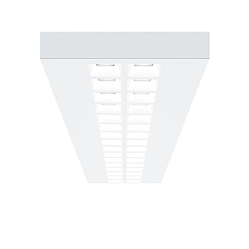 Flache und modulare LED Deckenanbauleuchte mit Linsenoptik. Leuchten Leistung: 23,3 W, mit LED-Konverter, LED-Lebensdauer 100000 h bis zu einem Lichtstromrückgang auf 80 % des Anfangswertes. Farborttoleranz (initial MacAdam): 2. Leuchten Lichtstrom: 3820 lm, Leuchten Lichtausbeute: 164 lm/W. Farbwiedergabe Ra > 80, Farbtemperatur 4000 K. Symmetrisch sehr breit abstrahlende Leuchte (wide beam). Lichtlenkung über quadratische Linsenoptik entblendete Lichtverteilung mit UGR < 19 und L65 < 3000 cd/m² gemäß EN 12464, geringe Schmutzempfindlichkeit und einfache Reinigung, flaches Leuchtengehäuse aus Stahlblech pulverbeschichtet in weiß, Leuchtengehäuse mit sichtbarer Leuchtenhöhe von 52mm, Leuchte halogenfrei verdrahtet, Abmessungen: 1200 x 300 x 52 mm, Gewicht: 7 kg