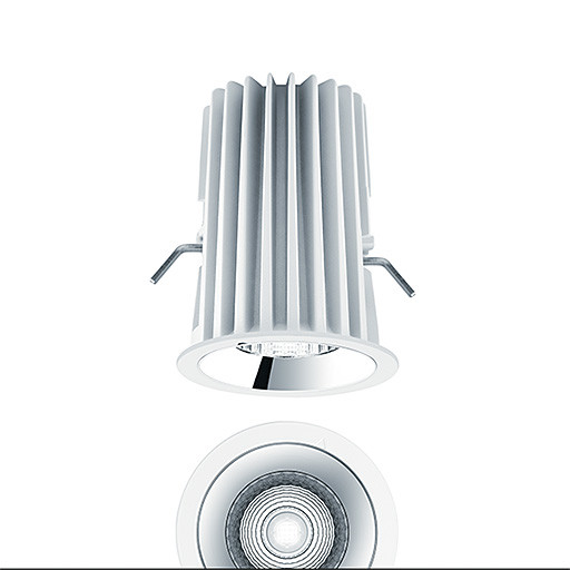LED Decken-Einbauleuchte für leistungsstarke Akzentbeleuchtung, präzise Lichtverteilung ohne Streulicht und sehr gute Entblendung, Bestückung: LED1100-927, (30 °) FLOOD-Abstrahlcharakteristik, Reflektor: silber, hochglänzend, Farbwiedergabe Ra > 90, Farbtemperatur 2700 K (warm weiß), Leuchten Lichtstrom: 1100 lm, Leuchten Lichtausbeute: 79 lm/W, Lebensdauer: 50000h bei 80% Lichtstrom, mit separater Vorschaltgeräte-Einheit DALI steuerbare Leuchte (DALI only), höchste Brillanz durch speziell ausgelegten Reflektor aus Reinstaluminium, silber eloxiert, passive Kühlung integriert im Gehäuse, Gehäuse aus Aluminiumdruckguss, Abdeckring weiß, Leuchte halogenfrei verdrahtet, Anschluss: 5-polige Steckverbindungsklemme, Leuchten Leistung: 14 W, Netzspannung: 220-240 V / 0/50/60 Hz, Montage: mittels verdeckter Schraubbefestigung für Deckenstärken von 1-25mm, Deckenausschnitt: Durchmesser 68mm, Einbautiefe: 155 mm, Gewicht: 0,44 kg