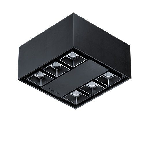 Kompakte, besonders flache, modulare quadratische LED-Deckenanbauleuchte (Komplettleuchte) zur flexiblen Akzentbeleuchtung und horizontalen Flächenbeleuchtung, mit verschiedenen Lichtverteilungen (Spot, Flood, Wideflood) hoher Brillanz und sehr guter Entblendung, mit 2x3 miniaturisierten Einzellichtköpfen in linearer Anordnung, präzise und gleichmäßige Lichtverteilung,1. Reihe der Lichtverteilung Leuchte mit VERY WIDEFLOOD-Abstrahlcharakteristik, 2. Reihe Wallwasher, rechts, sehr gute Entblendung UGR<13, Abblendwinkel 45°, Leuchten Leistung: 18,6 W, Farbwiedergabe Ra > 90, Farbtemperatur 3000 K, Farborttoleranz (initial MacAdam): 2, Leuchten Lichtstrom: 1200 lm, Leuchten Lichtausbeute: 65 lm/W, Lebensdauer: 50000h bei 90% Lichtstrom, DALI steuerbare Leuchte (DALI only), Gehäuse aus Aluminiumdruckguss, schwarz lackiert Reflektorfarbe: schwarz, Leuchte halogenfrei verdrahtet, IP20, Netzspannung: 220-240 V / 50/60 Hz, zentralbatterietauglich gemäß EN 60598-2-22, Notstromlevel auf 100% eingestellt (programmierbar 15-100% nur mit Dali und Bluetooth), Gewicht: 0,91 kg