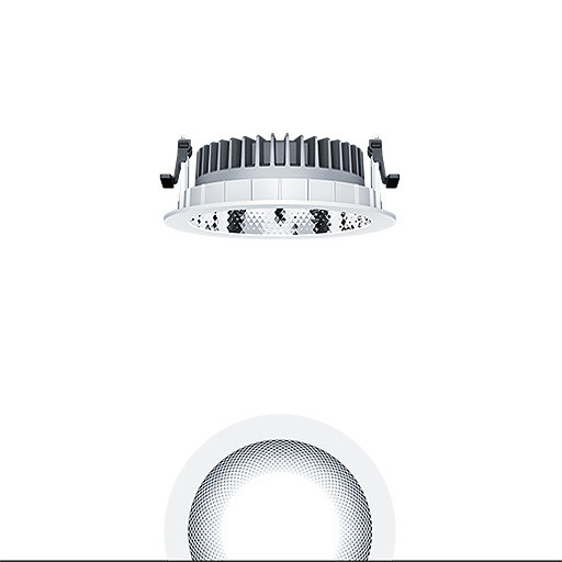 LED Decken-Einbauleuchte (Komplettleuchte) R150, symmetrisch, breitstrahlender Lichtverteilung (81 °), höchste Leuchteneffizienz und eine optimale Downlight Lichttechnik, hohe Nachhaltigkeit aufgrund durchgängigen, maximal- modularen Aufbau und austauschbaren Komponenten, Austauschbares LED-Modul, Farbwiedergabe Ra > 80, Farbtemperatur 4000 K, Farborttoleranz (initial MacAdam): 2, Leuchten Leistung: 21,9 W, Leuchten Lichtstrom: 3230 lm, Leuchten Lichtausbeute: 147 lm/W, Mittlere Bemessungslebensdauer: L90 100000 h bei 25 °C + L95 50000 h bei 25 °C, mit separaten, steckbaren LED-Konverter, DALI steuerbare Leuchte (DALI only) mit DC-Funktion, einstellbar 1-100 %, Notstromlevel auf 15% voreingestellt, NFC konfigurierbar, SwitchDIM-kompatibel, hochwertige Reflektoreinheit über Bajonettverschluss an modularer LED-Lichtkammer arretiert, hocheffiziente LED Lichtkammer integriert im optimierten, passiven Wärmemanagement aus recycelten Aluminiumdruckguss, Reflektor/Abdeckring aus hochwertigem, UV-beständigem Polycarbonat (PC), Reflektor: facettiert, aluminiumbesputtert, hochglänzend, irisierungsfrei, Abdeckring: weiß, Einbauring aus Polycarbonat (PC), weiß, Schutzart: IP54_IP20, Leuchte halogenfrei verdrahtet, Anschluss: 5-polige Steckverbindungsklemme, Durchschleifen möglich, Netzspannung: 220-240 V / 0/50/60 Hz, Zentralbatterietauglich 220-240V DC, Montage: werkzeuglose Schnellmontage mittels Anti-Rutsch-Haltefedern für Deckenstärken von 1-25mm (je nach Leuchtenvariante) aufgrund austauschbarer Haltestege, werkzeuglose Schnellmontage der Leuchteneinheit mittels Bajonettverschluss, Deckenausschnitt: 150mm, Einbautiefe: 70mm, Gewicht: 0,68 kg Geringe Einbautiefe bei Einsatz mit limitiertem Platz in der Decke.