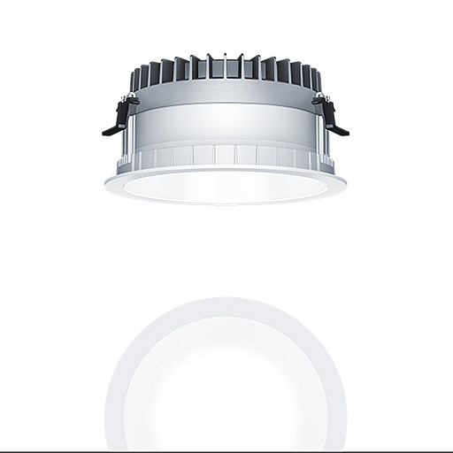LED Decken-Einbauleuchte (Komplettleuchte) R200, symmetrisch, breitstrahlender Lichtverteilung (81 °), höchste Leuchteneffizienz und eine optimale Downlight Lichttechnik, hohe Nachhaltigkeit aufgrund durchgängigen, maximal- modularen Aufbau und austauschbaren Komponenten, Austauschbares LED-Modul, Farbwiedergabe Ra > 80, Farbtemperatur 4000 K, Farborttoleranz (initial MacAdam): 2, Leuchten Leistung: 27,5 W, Leuchten Lichtstrom: 3930 lm, Leuchten Lichtausbeute: 143 lm/W, Mittlere Bemessungslebensdauer: L90 100000 h bei 25 °C + L95 50000 h bei 25 °C, mit separaten, steckbaren LED-Konverter, schaltbare Leuchte, hochwertige Reflektoreinheit über Bajonettverschluss an modularer LED-Lichtkammer arretiert, hocheffiziente LED Lichtkammer integriert im optimierten, passiven Wärmemanagement aus recycelten Aluminiumdruckguss, Reflektor/Abdeckring aus hochwertigem, UV-beständigem Polycarbonat (PC), Reflektor: weiß lackiert, Abdeckring: weiß, Einbauring aus Polycarbonat (PC), weiß, Schutzart: IP54_IP20, Leuchte halogenfrei verdrahtet, Anschluss: 3-polige Steckverbindungsklemme, Durchschleifen möglich, Netzspannung: 220-240 V / 0/50/60 Hz, Zentralbatterietauglich 220-240V DC, Montage: werkzeuglose Schnellmontage mittels Anti-Rutsch-Haltefedern für Deckenstärken von 1-40mm (je nach Leuchtenvariante) aufgrund austauschbarer Haltestege, werkzeuglose Schnellmontage der Leuchteneinheit mittels Bajonettverschluss, Deckenausschnitt: 200mm, Einbautiefe: 120mm, Gewicht: 1,07 kg