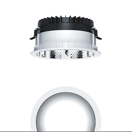 LED Decken-Einbauleuchte (Komplettleuchte) R200, symmetrisch, breitstrahlender Lichtverteilung (80 °), höchste Leuchteneffizienz und eine optimale Downlight Lichttechnik, hohe Nachhaltigkeit aufgrund durchgängigen, maximal- modularen Aufbau und austauschbaren Komponenten, Austauschbares LED-Modul, Farbwiedergabe Ra > 80, Farbtemperatur 3000 K, Farborttoleranz (initial MacAdam): 2, Leuchten Leistung: 8,1 W, Leuchten Lichtstrom: 1130 lm, Leuchten Lichtausbeute: 140 lm/W, Mittlere Bemessungslebensdauer: L90 100000 h bei 25 °C + L95 50000 h bei 25 °C, mit separaten, steckbaren LED-Konverter, DALI steuerbare Leuchte (DALI only) mit DC-Funktion, einstellbar 1-100 %, Notstromlevel auf 15% voreingestellt, NFC konfigurierbar, SwitchDIM-kompatibel, hochwertige Reflektoreinheit über Bajonettverschluss an modularer LED-Lichtkammer arretiert, hocheffiziente LED Lichtkammer integriert im optimierten, passives Wärmemanagement aus hochwertigem wärmeleitendem Polycarbonat, Reflektor/Abdeckring aus hochwertigem, UV-beständigem Polycarbonat (PC), Reflektor: facettiert, aluminiumbesputtert, hochglänzend, irisierungsfrei, Abdeckring: weiß, Einbauring aus Polycarbonat (PC), weiß, Schutzart: IP54_IP20, Leuchte halogenfrei verdrahtet, Anschluss: 5-polige Steckverbindungsklemme, Durchschleifen möglich, Netzspannung: 220-240 V / 0/50/60 Hz, Zentralbatterietauglich 220V DC, Montage: werkzeuglose Schnellmontage mittels Anti-Rutsch-Haltefedern für Deckenstärken von 1-40mm (je nach Leuchtenvariante) aufgrund austauschbarer Haltestege, werkzeuglose Schnellmontage der Leuchteneinheit mittels Bajonettverschluss, Deckenausschnitt: 200mm, Einbautiefe: 120mm, Gewicht: 0,77 kg Für Office Anwendungen gemäß EN12464 (UGR<19 Reflektortyp aluminiumbesputtert)