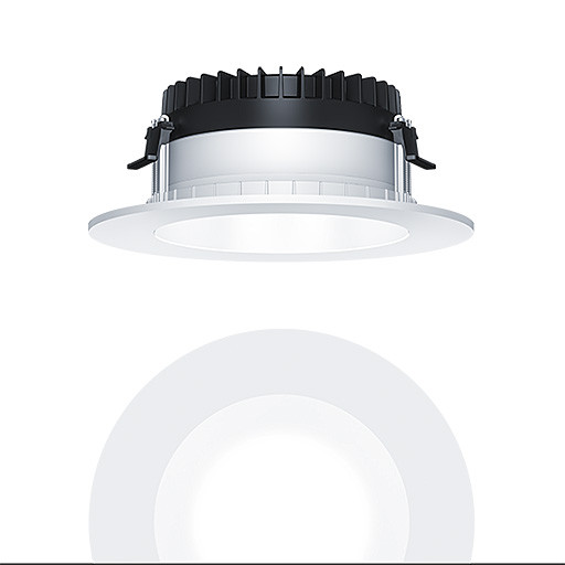 LED Decken-Einbauleuchte (Komplettleuchte) R200, mit breitem Leuchten-Abdeckring ideal für den Austausch in vorhandenen, größeren Deckenausschnitten, symmetrisch, breitstrahlender Lichtverteilung (79 °), höchste Leuchteneffizienz und eine optimale Downlight Lichttechnik, hohe Nachhaltigkeit aufgrund durchgängigen, maximal- modularen Aufbau und austauschbaren Komponenten, Austauschbares LED-Modul, Farbwiedergabe Ra > 90 (R9>50), Farbtemperatur 4000 K, Farborttoleranz (initial MacAdam): 2, Leuchten Leistung: 37 W, Leuchten Lichtstrom: 5300 lm, Leuchten Lichtausbeute: 143 lm/W, Mittlere Bemessungslebensdauer: L85 100000 h bei 25 °C + L90 50000 h bei 25 °C, mit separaten, steckbaren LED-Konverter, DALI steuerbare Leuchte (DALI only) mit DC-Funktion, einstellbar 1-100 %, Notstromlevel auf 15% voreingestellt, DALI konfigurierbar, SwitchDIM-kompatibel, hochwertige Reflektoreinheit über Bajonettverschluss an modularer LED-Lichtkammer arretiert, hocheffiziente LED Lichtkammer integriert im optimierten, passiven Wärmemanagement aus recycelten Aluminiumdruckguss, Reflektor/Abdeckring aus hochwertigem, UV-beständigem Polycarbonat (PC), Reflektor: aluminiumbesputtert, hochglänzend, irisierungsfrei, Abdeckring: weiß, Einbauring aus Polycarbonat (PC), weiß, Schutzart: IP43_IP20, Retrofitring mit breiten Leuchten Abdeckring, Reflektor rahmenlos / Abdeckring eine optisch bündige Einheit aus hochwertigem, UV-beständigem Polycarbonat (PC), ultraschallverschweißt, Leuchte halogenfrei verdrahtet, Anschluss: 3-polige Steckverbindungsklemme, Durchschleifen möglich, Netzspannung: 220-240 V / 0/50/60 Hz, Zentralbatterietauglich 220V DC, Montage: werkzeuglose Schnellmontage mittels Anti-Rutsch-Haltefedern für Deckenstärken von 1-40mm (je nach Leuchtenvariante), werkzeuglose Schnellmontage der Leuchteneinheit mittels Bajonettverschluss, Deckenausschnitt: 205-250mm, Einbautiefe: 120mm, Gewicht: 1,5 kg Geringe Einbautiefe bei Einsatz mit limitiertem Platz in der Decke.