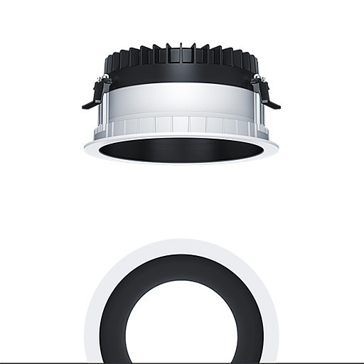 LED Decken-Einbauleuchte (Komplettleuchte) R200, symmetrisch, breitstrahlender Lichtverteilung (77 °), höchste Leuchteneffizienz und eine optimale Downlight Lichttechnik, hohe Nachhaltigkeit aufgrund durchgängigen, maximal- modularen Aufbau und austauschbaren Komponenten, Austauschbares LED-Modul, Farbwiedergabe Ra > 90, Farbtemperatur (tunable) 2700-6500 K (DT8), Farborttoleranz (initial MacAdam): 2, Leuchten Leistung: 16,3 W, Leuchten Lichtstrom: 1300 lm, Leuchten Lichtausbeute: 80 lm/W, Mittlere Bemessungslebensdauer: L80 100000 h bei 25 °C + L90 50000 h bei 25 °C, mit separaten, steckbaren LED-Konverter, DALI steuerbare Leuchte (DALI only) mit DC-Funktion, einstellbar 5-100 %, Notstromlevel auf 15% voreingestellt, DALI konfigurierbar, SwitchDIM-kompatibel, hochwertige Reflektoreinheit über Bajonettverschluss an modularer LED-Lichtkammer arretiert, hocheffiziente LED Lichtkammer integriert im optimierten, passives Wärmemanagement aus hochwertigem wärmeleitendem Polycarbonat, Reflektor/Abdeckring aus hochwertigem, UV-beständigem Polycarbonat (PC), Reflektor: schwarz lackiert, Abdeckring: weiß, Einbauring aus Polycarbonat (PC), weiß, Schutzart: IP54_IP20, Leuchte halogenfrei verdrahtet, Anschluss: 3-polige Steckverbindungsklemme, Durchschleifen möglich, Netzspannung: 220-240 V / 0/50/60 Hz, Zentralbatterietauglich 220-240V DC, Montage: werkzeuglose Schnellmontage mittels Anti-Rutsch-Haltefedern für Deckenstärken von 1-40mm (je nach Leuchtenvariante) aufgrund austauschbarer Haltestege, werkzeuglose Schnellmontage der Leuchteneinheit mittels Bajonettverschluss, Deckenausschnitt: 200mm, Einbautiefe: 120mm, Gewicht: 0,75 kg Für Office Anwendungen gemäß EN12464 (UGR<19 Reflektortyp aluminiumbesputtert)