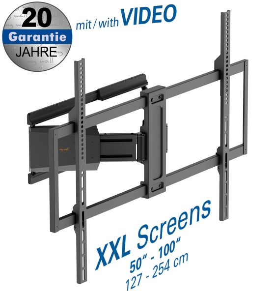 Mit der hochwertigen TV Wandhalterung bringen Sie Ihren XXL-Fernseher bis 100 Zoll (254 cm) sicher, stilvoll und platzsparend an die Wand. Die stabile Wandhalterung überzeugt mit ihrem modernen Slim Design und sorgt mit einem minimalen Wandabstand von nur 3,5 cm für einen eleganten, fast schwebenden Look Ihres TVs. Je nach Sitzposition lässt sich die Halterung bis auf einen Abstand von 25,9 cm in den Raum hineinziehen. Trotz der filigranen Erscheinung trägt die robuste Halterung schwere TV bis zu einem Gewicht von 65 kg absolut sicher und zuverlässig. Dazu bietet die flexible TV Halterung viel Bewegungsfreiheit - drehen, neigen oder ausziehen, um jederzeit den besten Blickwinkel zu genießen. Dank der innovativen Quick Release Funktion lässt sich der Fernseher im Handumdrehen von der Halterung lösen, sodass Kabelanschlüsse schnell und unkompliziert erreichbar bleiben. Ob für Filmabende, Gaming oder Sportereignisse - mit der schwenkbaren TV Wandhalterung holen Sie sich maximale Stabilität, Flexibilität und Komfort in Ihr Wohnzimmer. Die perfekte Lösung für Heimkino oder Gaming-Setup ? Für XXL Fernseher bis 100" (254 cm) ? Hohe Tragfähigkeit bis 65 kg ? Slim Design für platzsparende TV-Montage ? Schwenkbar, neigbar und ausziehbar für perfekte Sicht ? Quick Release Funktion für einfachen Zugang zu Kabeln Technische Details: Für Bildschirme 50" - 100" (127 - 254 cm) Belastung bis 65 kg Wandabstand 35 - 259 mm Seitlich drehbar: 60 ° Neigung: +3° / -15° VESA 200x200,200x300,300x200,200x400,400x200, 300x300,300x400,400x300,600x200,500x300,400x400, 600x300,500x400,400x600,600x400,700x400, 800x400,600x600,800x500,800x600 Mit Kabelmanagement Inklusive Befestigungsmaterial und Montageanleitung